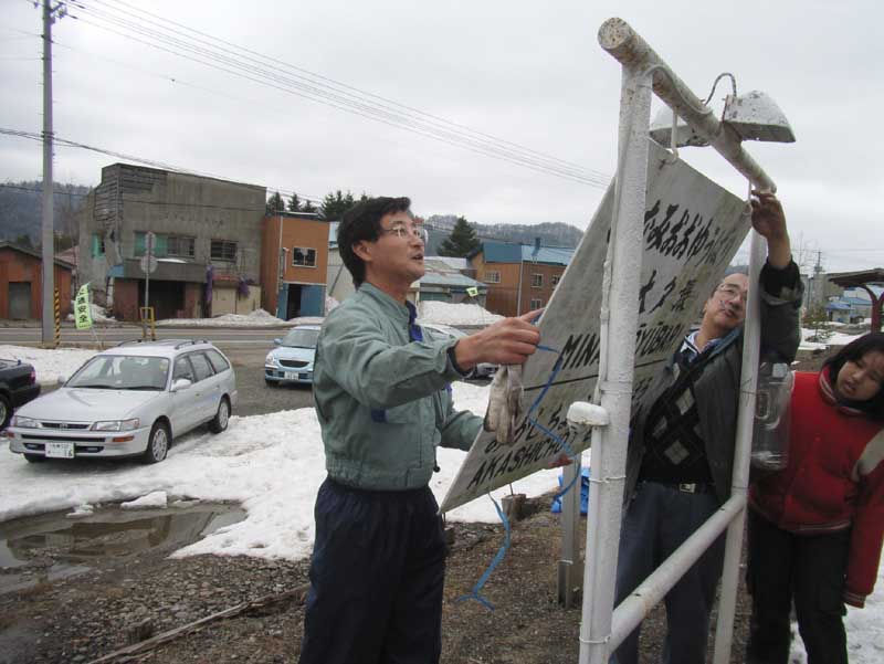 | まだホームには残雪がありましたが、4月22日に客車を覆っていたシートを外して 車両の公開を開始しました。 作業の参加者は、今井、伊藤(勲)、川合、由浪、坂井(父娘)、葛西、谷口の8名でした。 |
