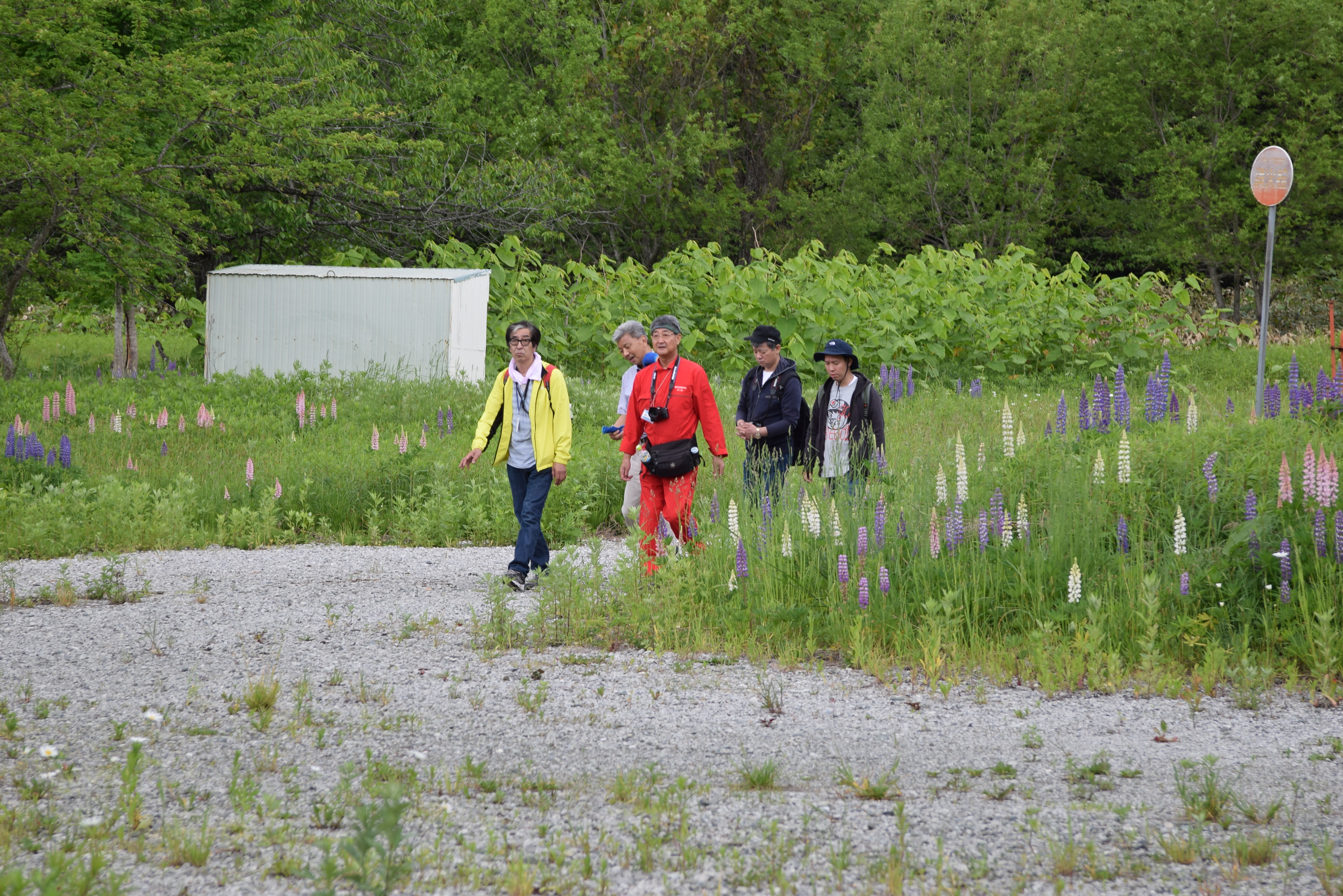 お花畑を歩くおじさんたち。赤・青・黄色…