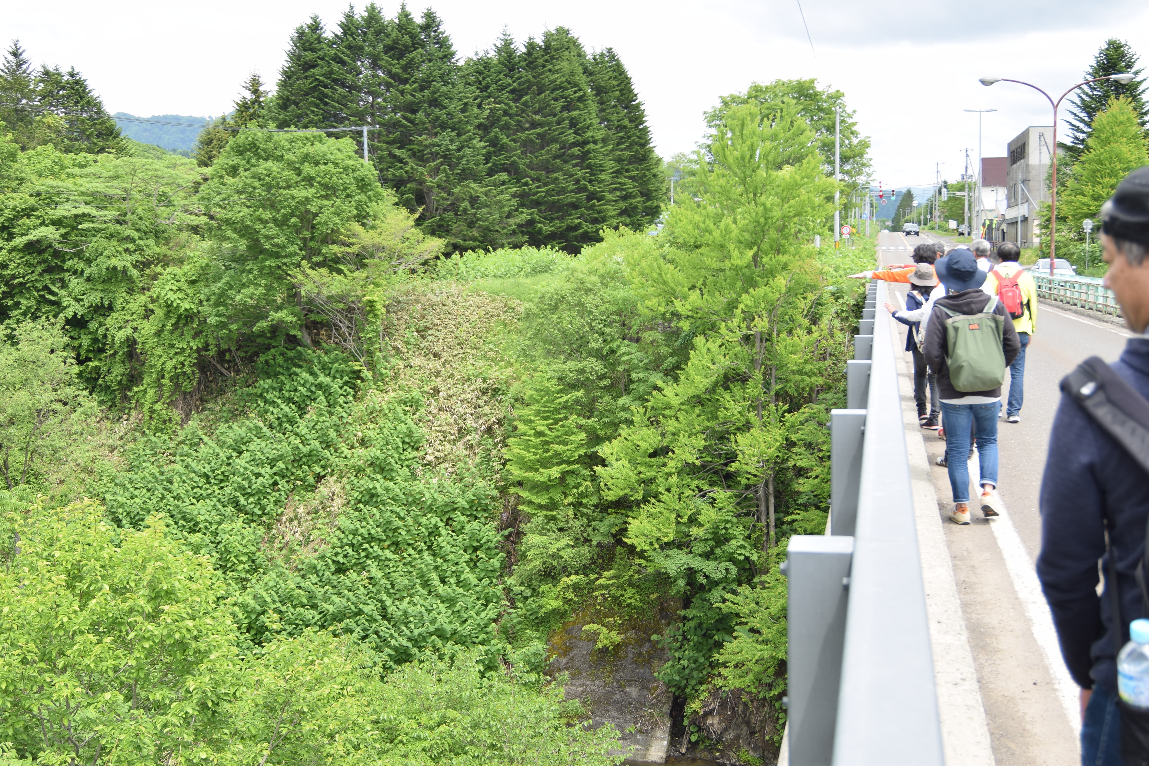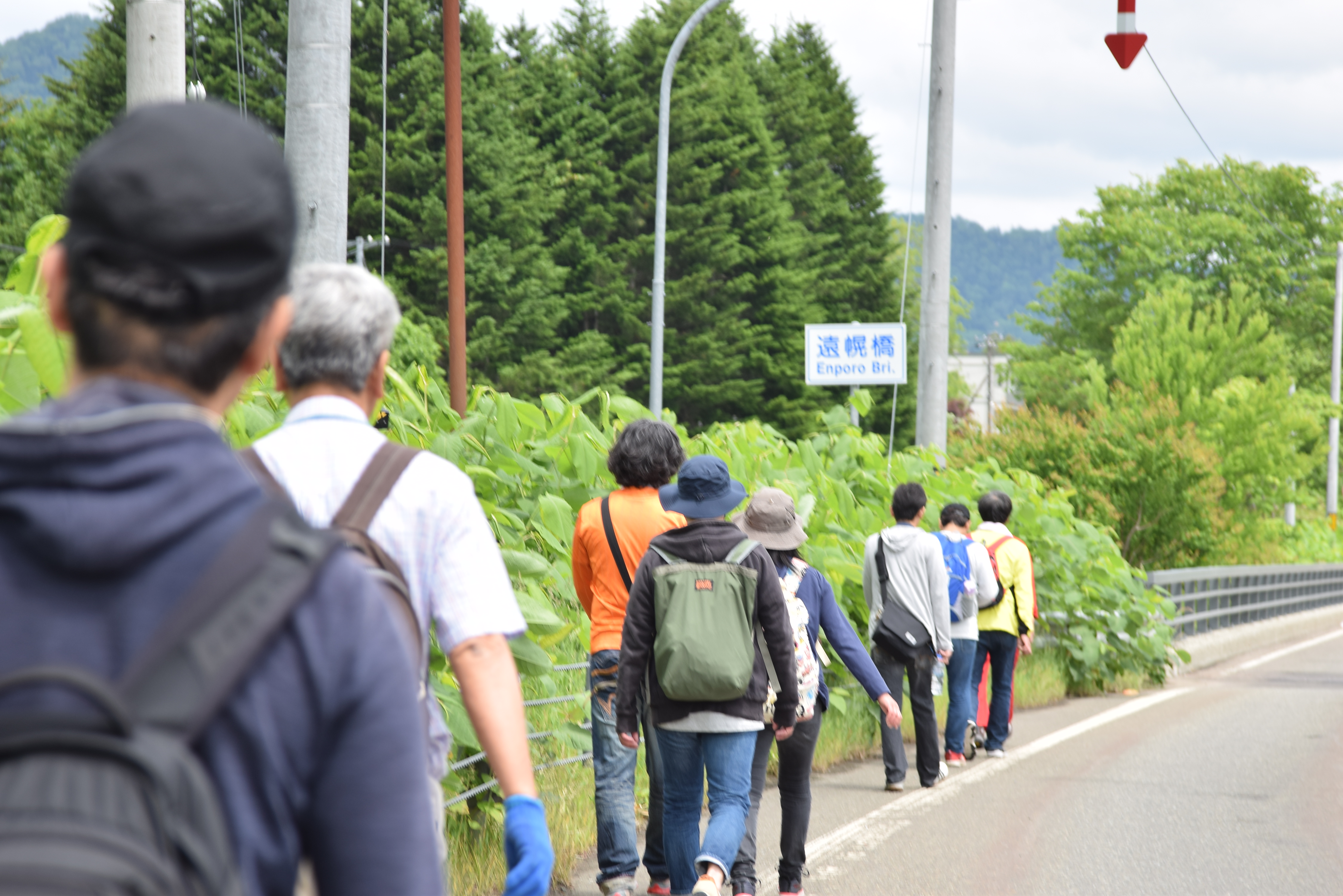 白線の内側を一列に歩く一行。道路橋はローマ字で「えんぽろ」と書かれていますね。